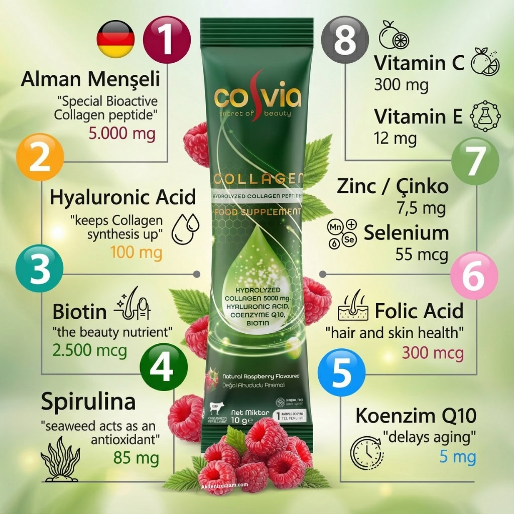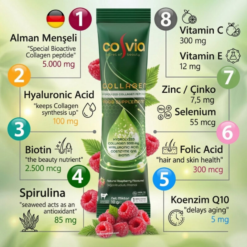 Cosvia, sadece bir kolajen takviyesi değil, aynı zamanda zenginleştirilmiş bir vitamin ve mineral kompleksidir. Cilt elastikiyetini artırmaya, nem dengesini korumaya ve yaşlanma belirtilerine karşı cildin direncini desteklemeye yardımcı olmak amacıyla geliştirilmiştir.